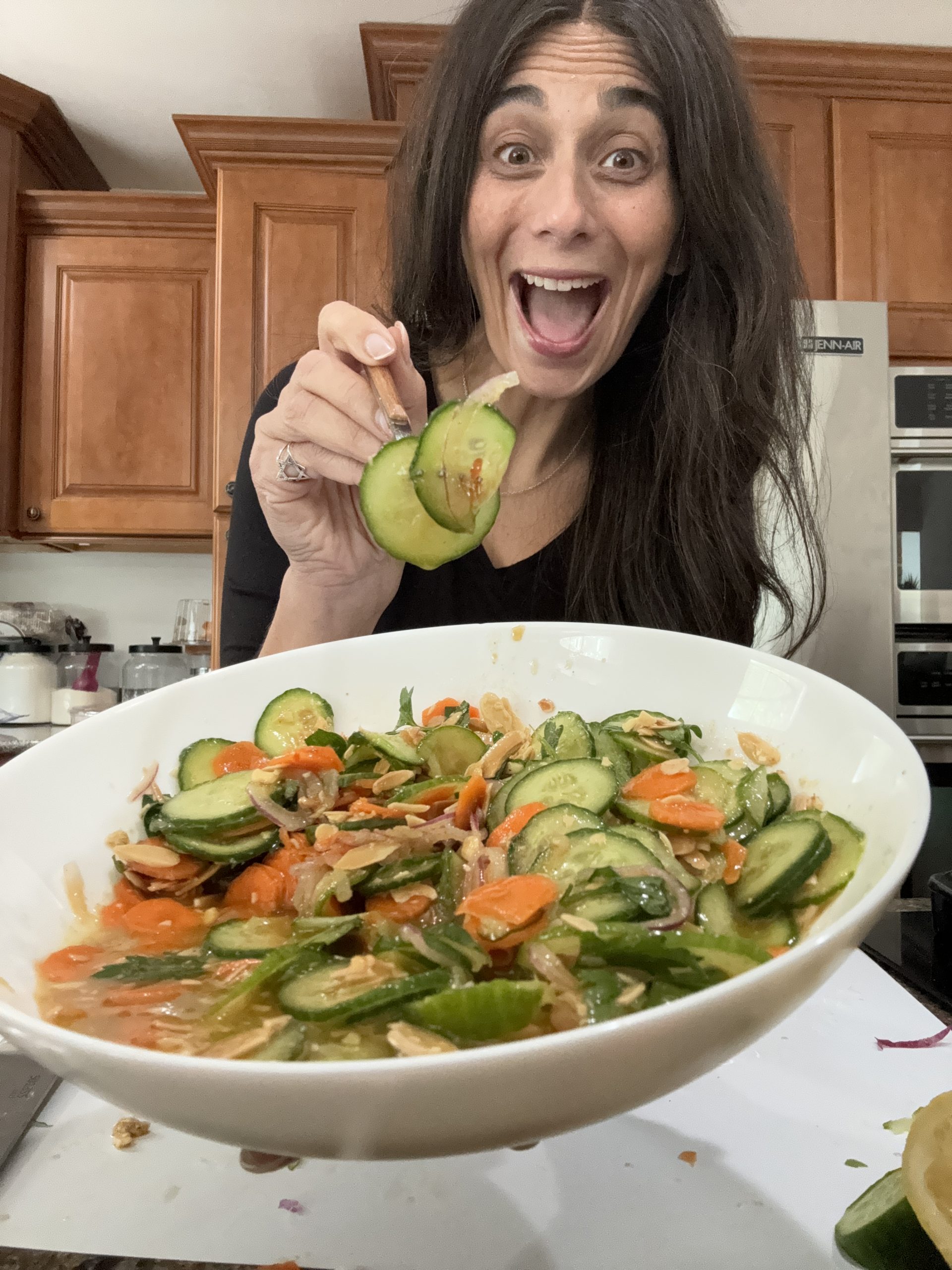 This one is a favorite I make all the time for Shabbat. And eat the leftovers all week long. It’s super refreshing and has all the flavor you want in a delicious crunchy salad.Â